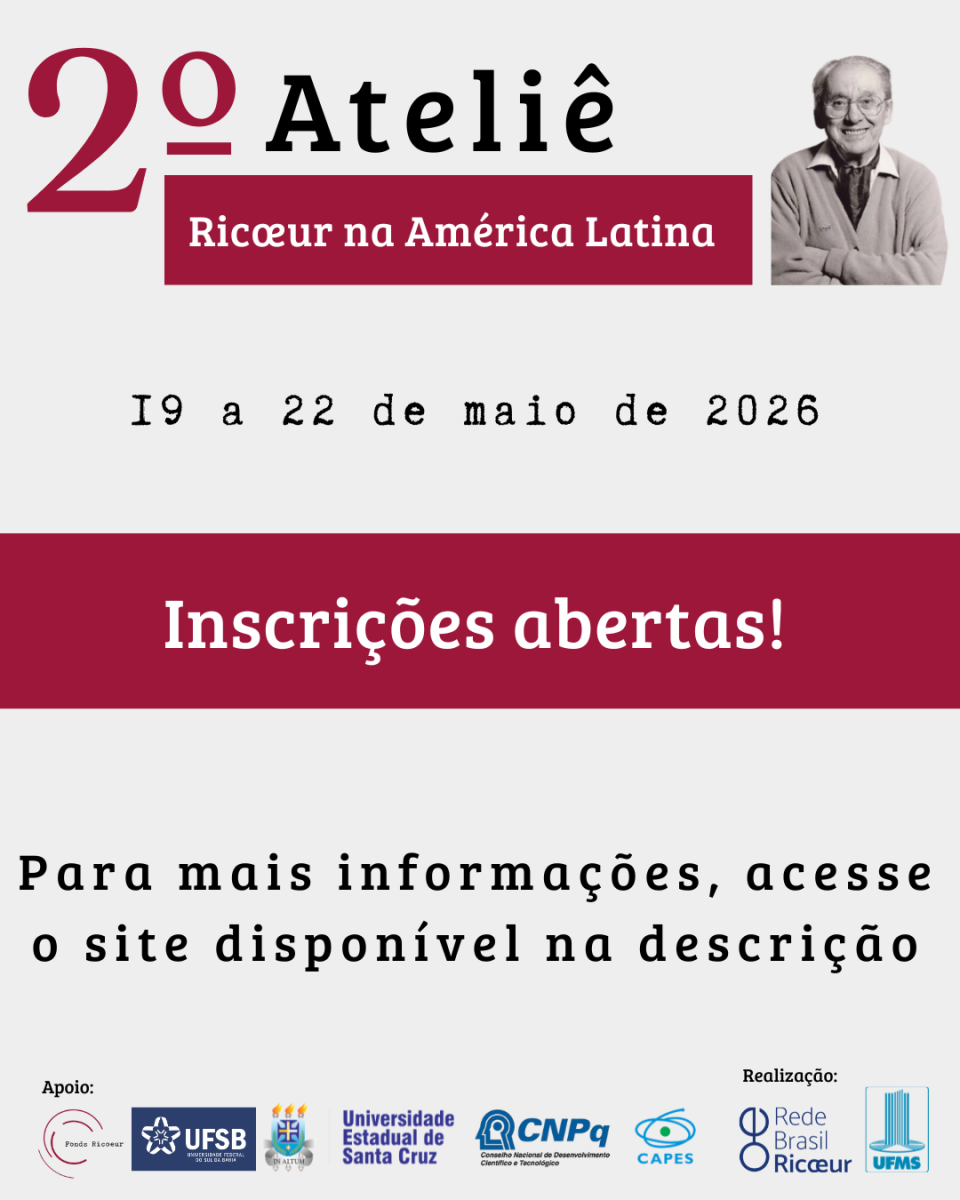 A Rede Brasil-Ricœur anuncia a abertura de inscrições para o 2º Ateliê Ricœur na América Latina, a realizar-se entre os dias 19 e 22 de maio de 2026, na UFMS – Universidade Federal de Mato Grosso do Sul, campus de Campo Grande.