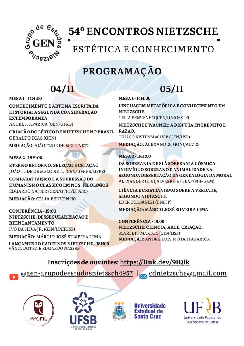 Nos dias 04 e 05 de novembro de 2025 ocorrerão os 54o Encontros Nietzsche. O evento é organizado pelo Grupo de Estudos Nietzsche – GEN, em parceria com PPGFIl (UFSB/UESC) e com a UFRB. Todas as atividades serão on-line e transmitidas no canal do GEN: https://www.youtube.com/@gen-grupodeestudosnietzsch4957. Haverá emissão de certificados para os ouvintes. As inscrições podem ser feitas por meio do formulário https://l1nk.dev/9IQlk. Para mais informações: cdnietzsche@gmail.com