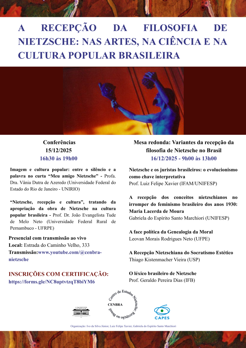 Nos dias 15 e 16 de dezembro de 2025 ocorrerá o evento "A recepção da filosofia de Nietzsche: nas artes, na ciência e na cultura popular brasileira". Organizado pelo Centro de Estudos Nietzsche: Recepção no Brasil (UNIFESP) o evento será transmitido pelo canal: www.youtube.com/@cenbra-nietzsche e no dia 15 será presencial no campus Guarulhos, também com transmissão. As inscrições com certificação para ouvintes podem ser feitas no seguinte link: https://forms.gle/NC8uptvtzqT8biYM6