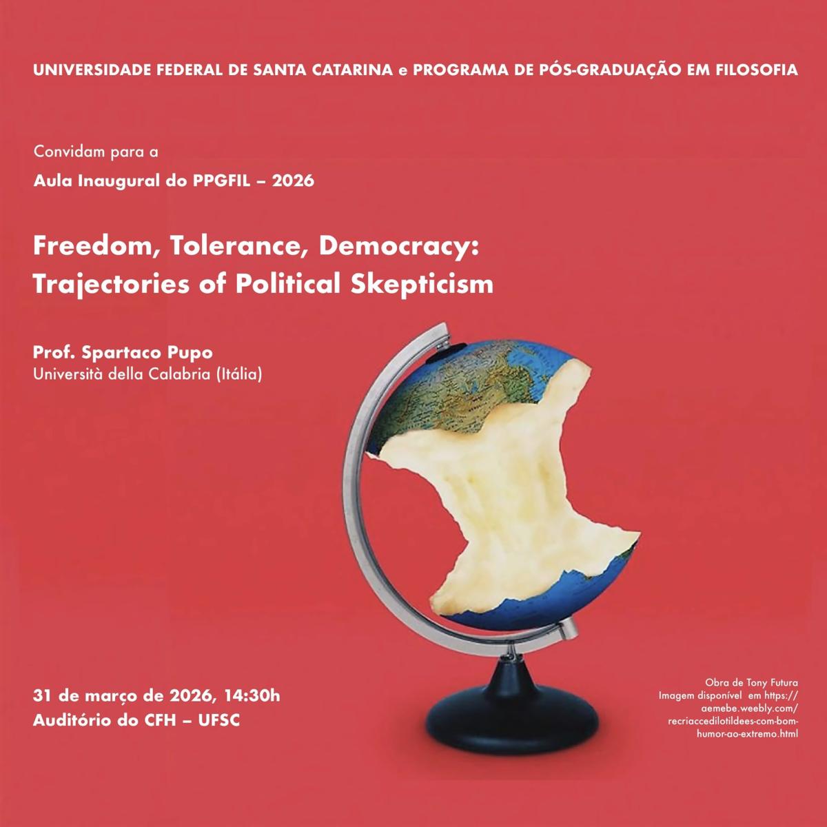 O Programa de Pós-Graduação em Filosofia (PPGFIL) da Universidade Federal de Santa Catarina (UFSC) convida para a Aula Inaugural de 2026, intitulada “Freedom, Tolerance, Democracy: Trajectories of Political Skepticism”, a ser ministrada pelo Prof. Spartaco Pupo (Università della Calabria, Itália).