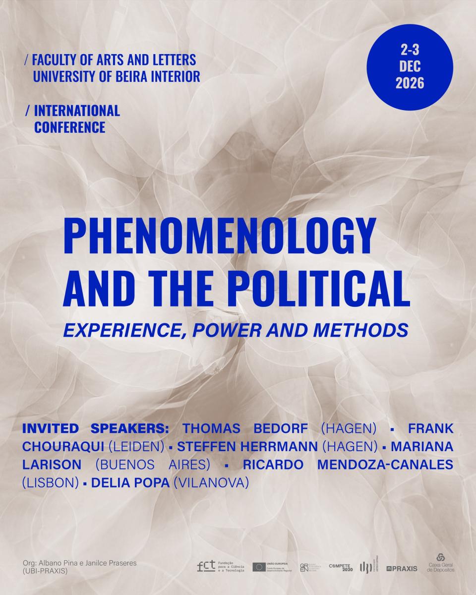 Nos dias 2 e 3 de dezembro de 2026, terá lugar na Universidade da Beira Interior a International Conference - Phenomenology and the Political: Experience, Power, and Methods, organizada por Albano Pina (Praxis-UBI) e Janilce Praseres (Praxis-UBI). Convidam-se os/as investigadores/as a submeter propostas de comunicação até 25 de julho de 2026. As propostas devem ser enviadas para o e-mail phenomenologyandthepolitical@gmail.com e incluir um resumo (até 400 palavras), seguido de uma breve nota biográfica (até 100 palavras).