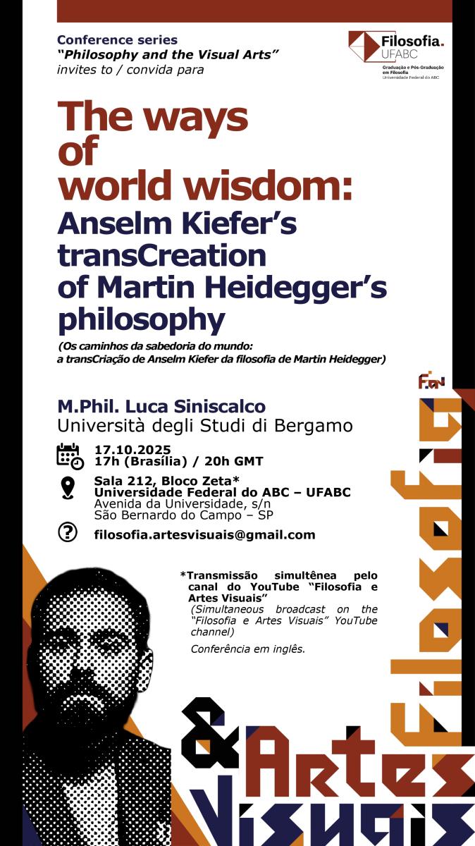 Convidamos todos/as para conferência  "The ways of world wisdom: Anselm Kiefer’s transCreation of Martin Heidegger’s philosophy" (Os caminhos da sabedoria do mundo: a transCriação de Anselm Kiefer da filosofia de Martin Heidegger), a ser proferida pelo Me. Luca Siniscalco (Universidade de Bérgamo, Itália), em formato híbrido, em 17.10.2025, às 17h (horário de Brasília) / 20h (GMT).