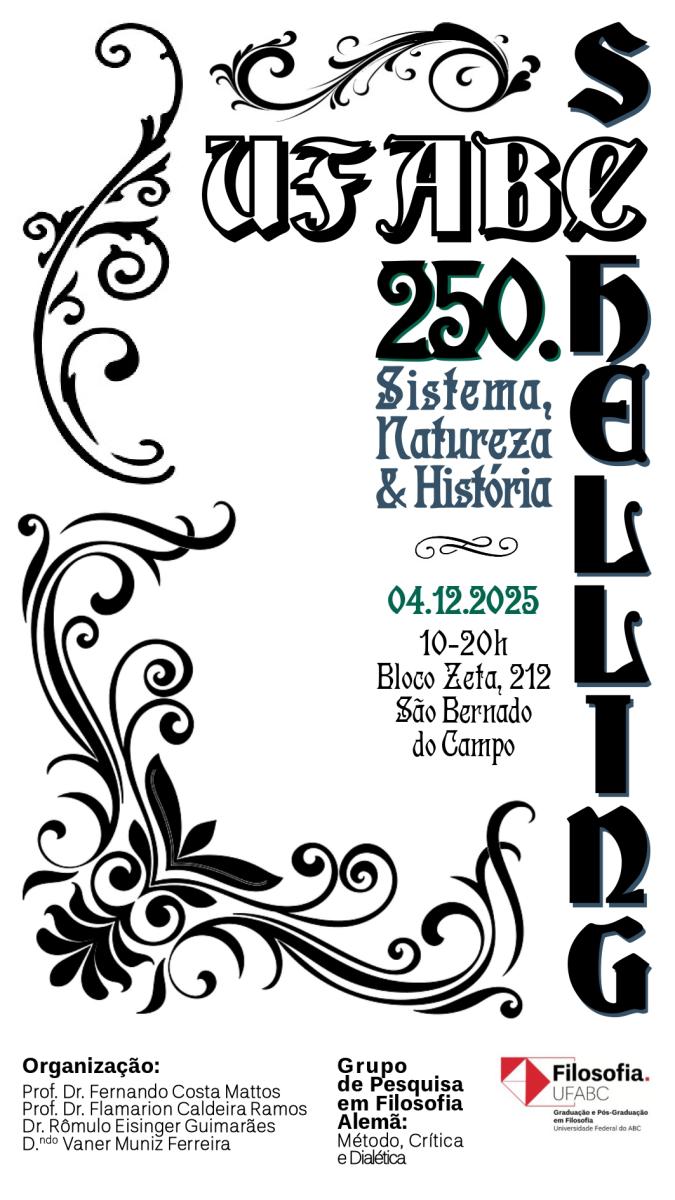 Organizado pelos Prof. Dr. Fernando Costa Mattos e Dr. Flamarion Caldeira Ramos (UFABC), bem como pelo Dr. Rômulo Eisinger Guimarães (PD-UFABC) e pelo D.ndo Vaner Muniz Ferreira (USP) — com o apoio do Grupo de Pesquisa em Filosofia Alemã: Método, Crítica e Dialética — este evento visa explorar a estrutura, o desenvolvimento e a atualidade do pensamento schellinguiano em suas múltiplas dimensões. Confira, abaixo, a programação: