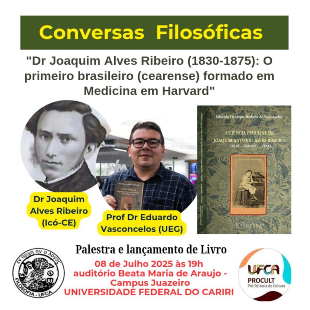 Sinopse: O projeto Conversas Filosóficas (Filosofia/Procult) apresenta em sua próxima edição, dia 08 de julho às 19h no auditório Beata Maria de Araújo (Campus Juazeiro), uma conferência sobre a inusitada história de um cearense de Icó que foi o primeiro brasileiro a se formar em Medicina na Universidade de Harvard (aos 23 anos), o Dr Joaquim Alves Ribeiro (1830-1875). Depois de voltar ao Brasil, ele se estabelece no Rio Grande do Norte e depois em Pernambuco, em 1858 volta ao Ceará, se tornando o médico dos despossuídos em Fortaleza. Em 1861, com a inauguração do primeiro Hospital da província, a Santa Casa de Misericórdia, torna-se seu primeiro médico. O Dr Alves Ribeiro foi um pioneiro no uso da anestesia (uso do Éter através do insensibilizador), publicou o jornal médico-científico A Lanceta e fundou o primeiro museu da Província, o Gabinete de História Natural do Ceará (1860), que se tornou o Museu de História Natural do Ceará.