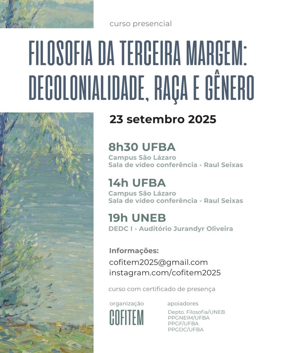 No dia 23 de Setembro de 2025, o Coletivo Filosofia da Terceira Margem realizará um Curso presencial intitulado "Filosofia da terceira margem: decolonialidade, raça e gênero".