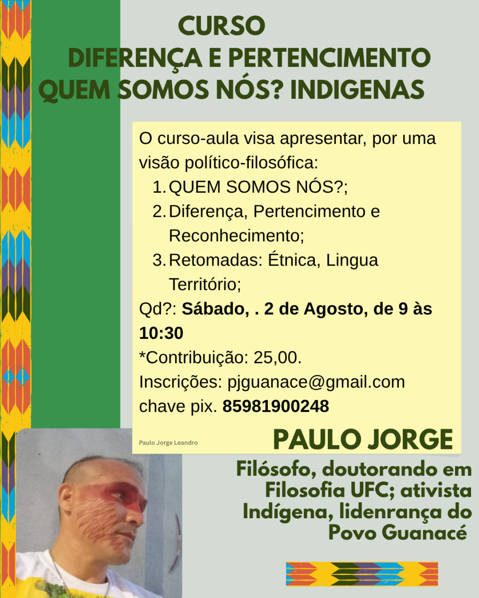 O curso-aula, é o segundo de uma série que traz à tona à filosofia o pensamento indígena a partir dos próprios indígenas. Nada sobre nós sem nós. Atualizando as questões de diferença e pertencimento para além da noção ocidental de identidade, seguindo às novas formulações político-filosóficas da noção de retomada indígena.