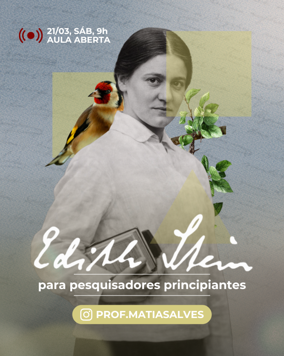 Aula aberta para pesquisadores principiantes da Fenomenologia de Edith Stein - sábado, às 9h, ministrada pelo Prof. Me. Lucas Matias Alves.