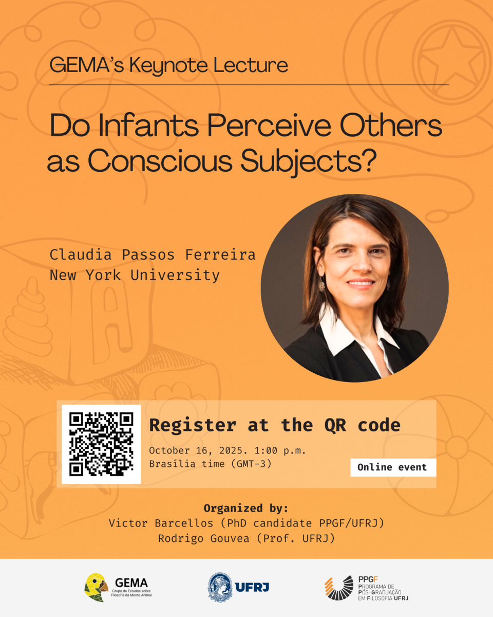 Estamos felizes em convidá-la(o) para a nossa segunda Keynote Lecture do GEMA. Neste ano, temos a honra de receber a professora Claudia Passos Ferreira, Assistant Professor de Bioética e Professora de Filosofia da New York University, EUA. Ela é amplamente reconhecida por suas contribuições à filosofia da mente, sobretudo quanto aos aspectos mentais em bebês, e bioética. O evento será realizado remotamente.