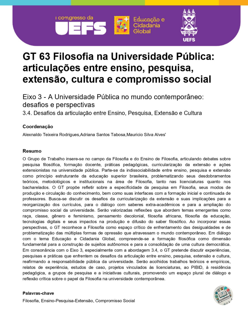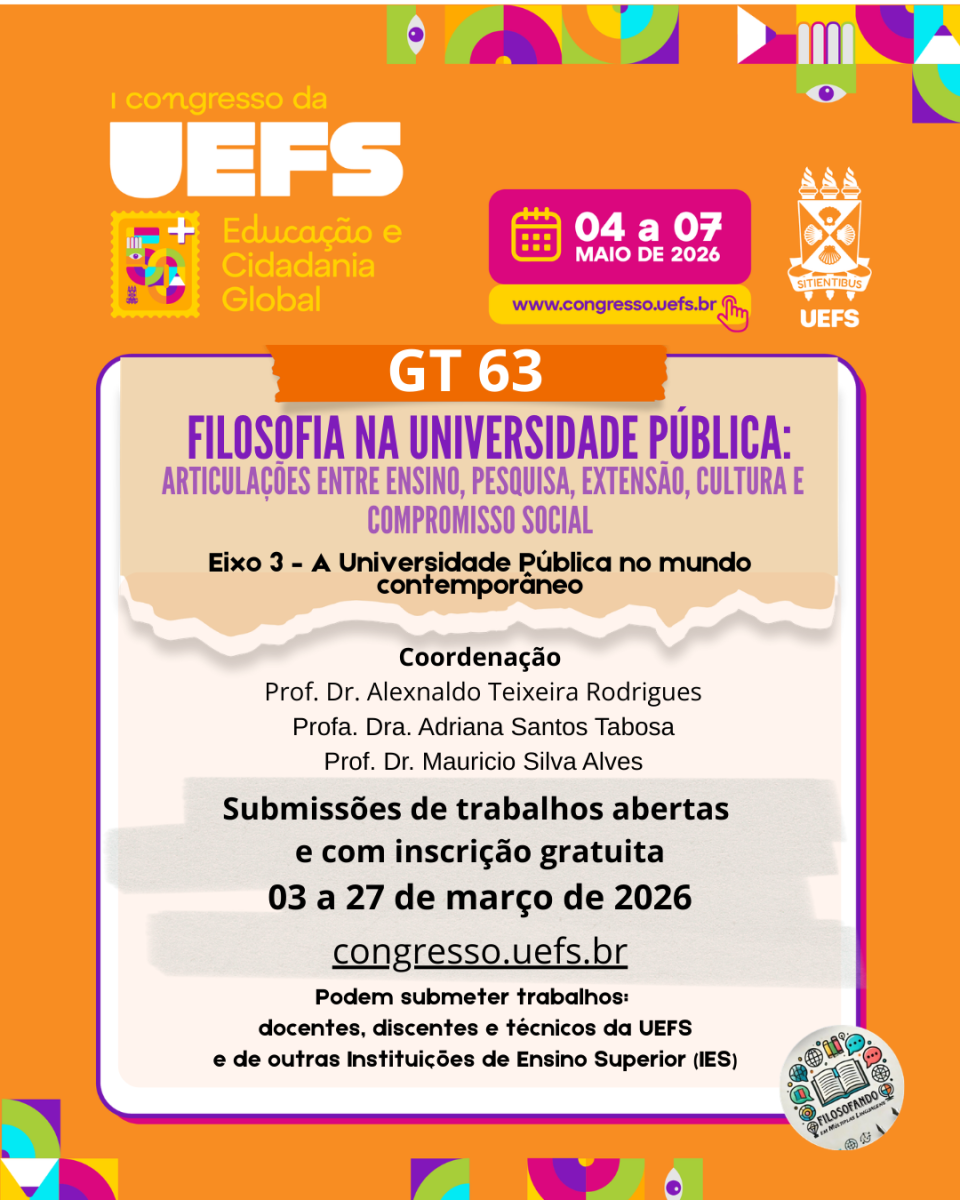 GT 63 - FILOSOFIA NA UNIVERSIDADE PÚBLICA | SUBMISSÕES GRATUITAS ABERTAS Congresso UEFS 50+ - Educação e Cidadania Global