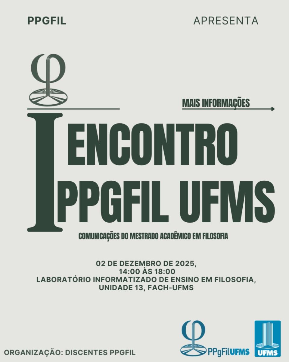 Para marcar simbolicamente a primeira turma e incentivar a produção teórico- acadêmica do corpo discente apresentamos a programação do I Encontro do Programa de Pós-graduação em Filosofia (Mestrado acadêmico) da Universidade Federal de Mato Grosso do Sul. O Encontro do PPgFil trata-se de um evento de natureza acadêmica, organizado pelos discentes. O objetivo do Encontro é a breve apresentação da pesquisa preliminar dos pós-graduandos e a discussão coletiva dos temas entre o público a partir da História da Filosofia. O Encontro será dividido em dois blocos temáticos, conforme as linhas de pesquisa do Programa: 1º bloco: Ética e Filosofia Política, que será mediado pelo Prof. Dr. André Koutchin; o 2º bloco: Epistemologia e Filosofia da Ciência, que será mediado pelo Prof. Dr. Vinícius Carvalho.