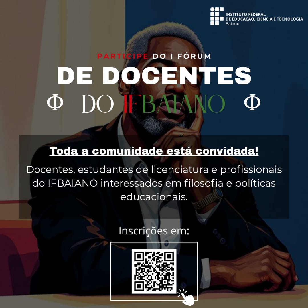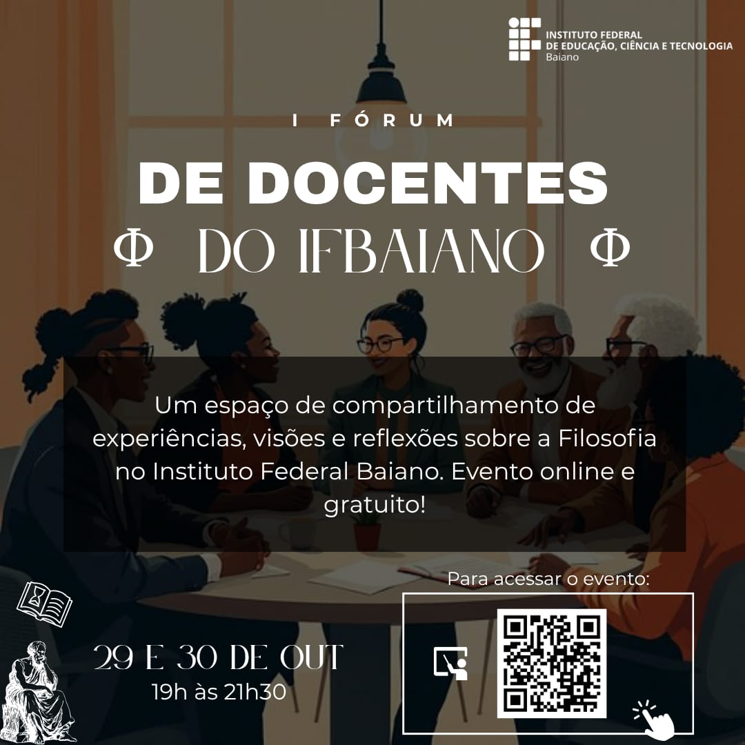 O I Fórum de Docentes do IFBAIANO é um evento organizado pelo coletivo de docentes de Filosofia do Instituto Federal Baiano e pretende ser um espaço de compartilhamento de experiências, visões e reflexões sobre a Filosofia em nosso instituto. O evento será online, via RNP, e acontecerá nos dias 29 e 30 de outubro, das 19h às 21h30.
