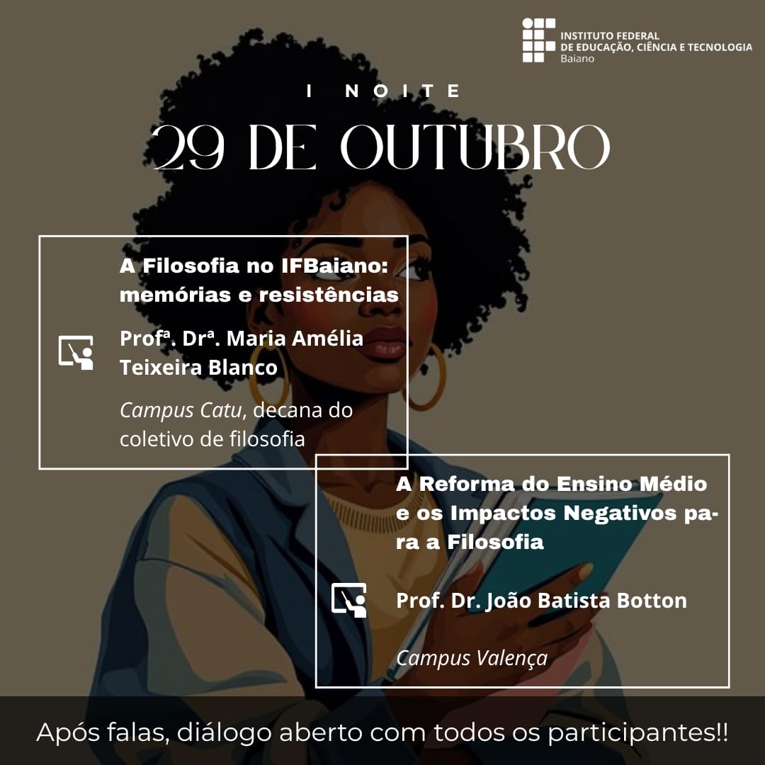 1. "A Filosofia no IFBAIANO: memórias e resistências" com a Profa. Dra. Maria Amélia Teixeira Blanco, do Campus Catu e decana do coletivo de Filosofia do IFBAIANO.