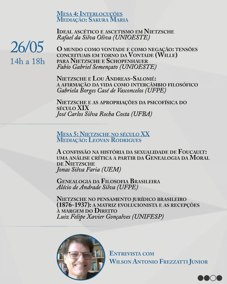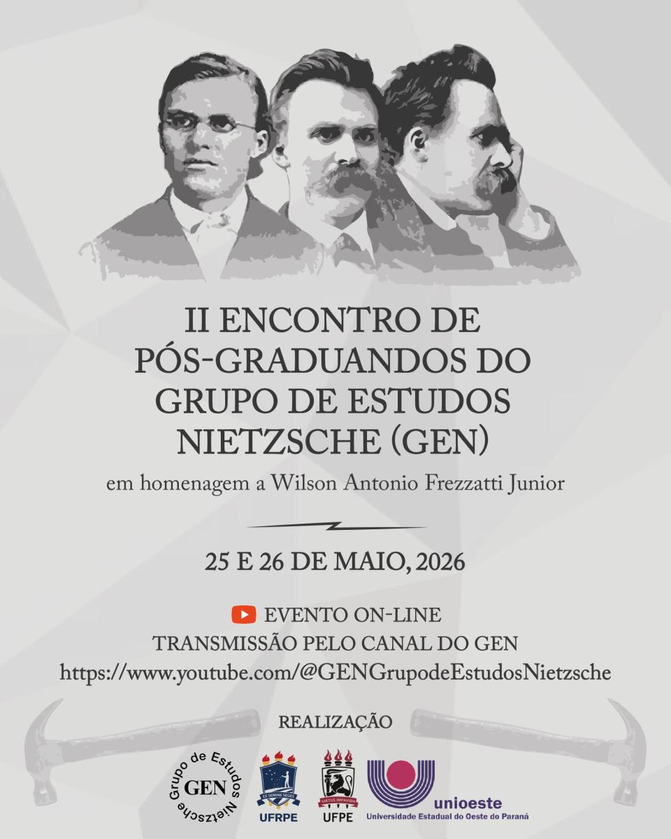Convidamos a comunidade acadêmica a acompanhar o II Encontro de Pós-Graduandos do GEN. O evento tem como objetivo divulgar pesquisas em torno da filosofia nietzschiana desenvolvidas pelos orientandos do grupo, além de promover o intercâmbio acadêmico entre seus participantes, incentivando o diálogo e a troca de perspectivas acerca do pensamento de Nietzsche. Ademais, o evento também homenageará o prof. Wilson Antonio Frezzatti Junior.