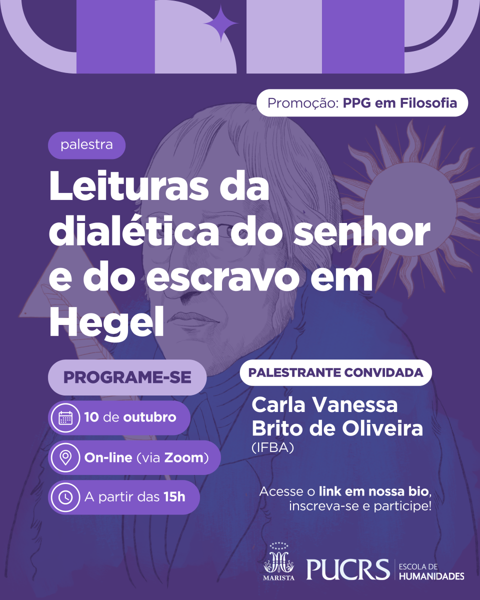 O PPG em Filosofia da PUCRS convida para o encontro "Leituras da dialética do senhor e do escravo em Hegel", com a participação da professora Carla Vanessa brito de Oliveira (IFBA).