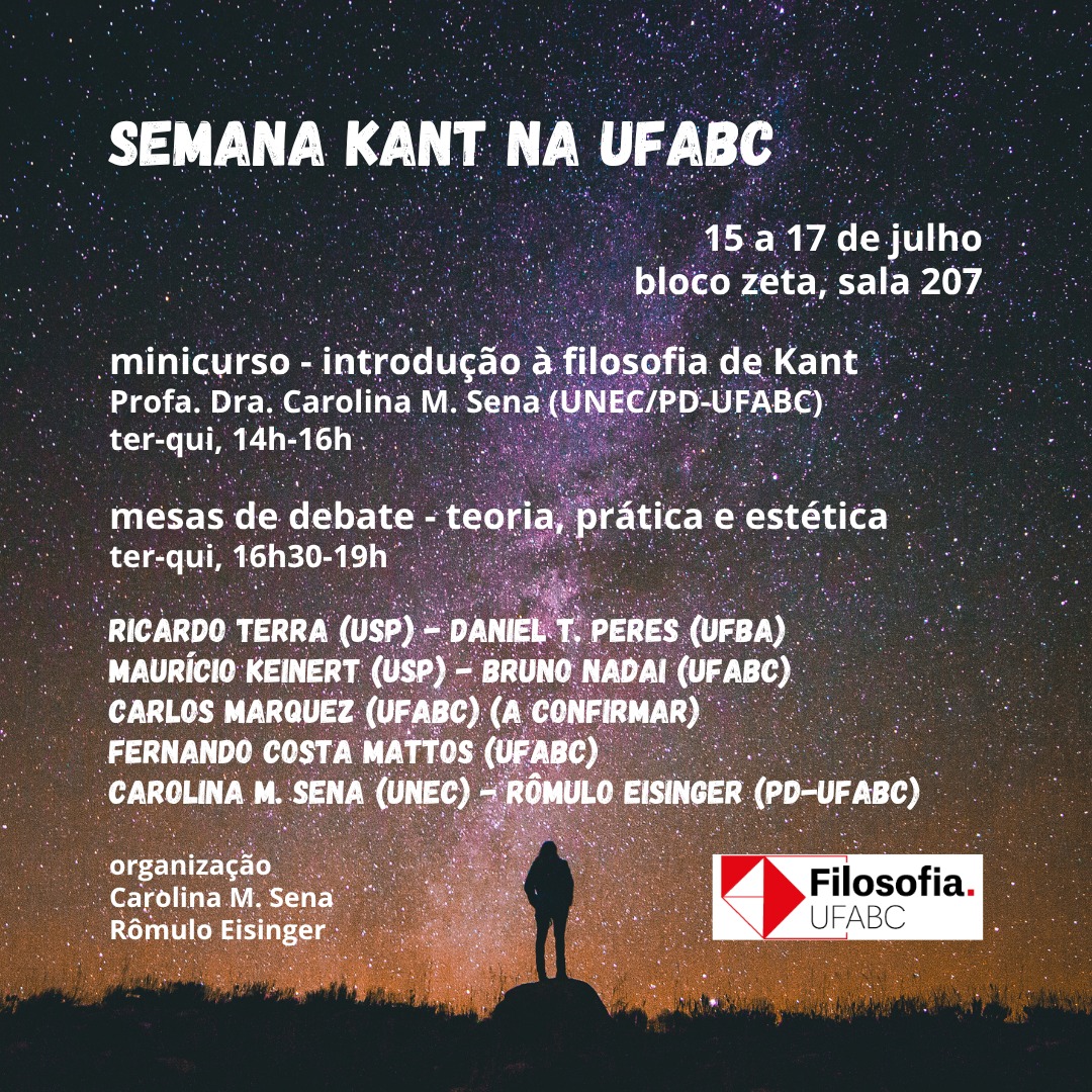A "Semana Kant na UFABC" acontecerá nos dias 15,16 e 17 de julho, no bloco zeta, sala 207. A programação contará com um minicurso intitulado "Introdução à Filosofia de Kant", ministrado pela Professora Doutora Carolina Miranda Sena (UNEC/PD-UFABC), além de mesas redondas sobre teoria, prática e estética kantianas. Os professores que irão compor as mesas redondas são: Ricardo Terra (USP), Daniel T. Peres (UFBA), Maurício Keinert (USP), Bruno Nadai (UFABC), Carlos Marques (UFABC), Fernando Costa Mattos (UFABC), Carolina Sena (UNEC/PD-UFABC) e Rômulo Guimarães (PD-UFABC).