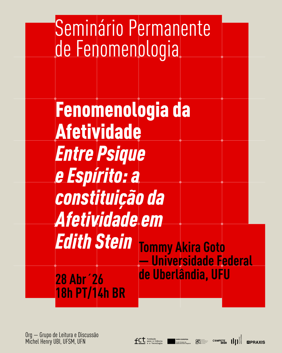 No próximo dia 28 de abril, às 18h de Lisboa (14h do Brasil), Tommy Akira Goto, professor Doutor da Universidade Federal de Uberlândia (UFU) apresentará a comunicação “Entre Psique e Espírito: a constituição da Afetividade em Edith Stein”. Esta comunicação está integrada no Seminário Permanente de Fenomenologia: Fenomenologia da Afetividade, organizado pelo Grupo de Leitura e Discussão Michel Henry – UBI, UFSM, UFN.