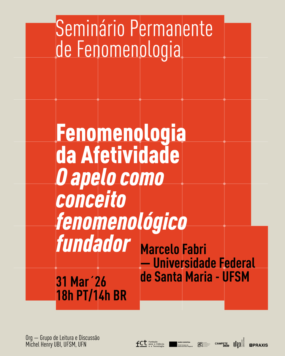 Esta atividade está integrada no Seminário Permanente de Fenomenologia: Fenomenologia da Afetividade - PRAXIS Centro de Filosofia, Política e Cultura (UBI/UÉ), organizado pelo Grupo de Leitura e Discussão Michel Henry – UBI, UFSM, UFN.
