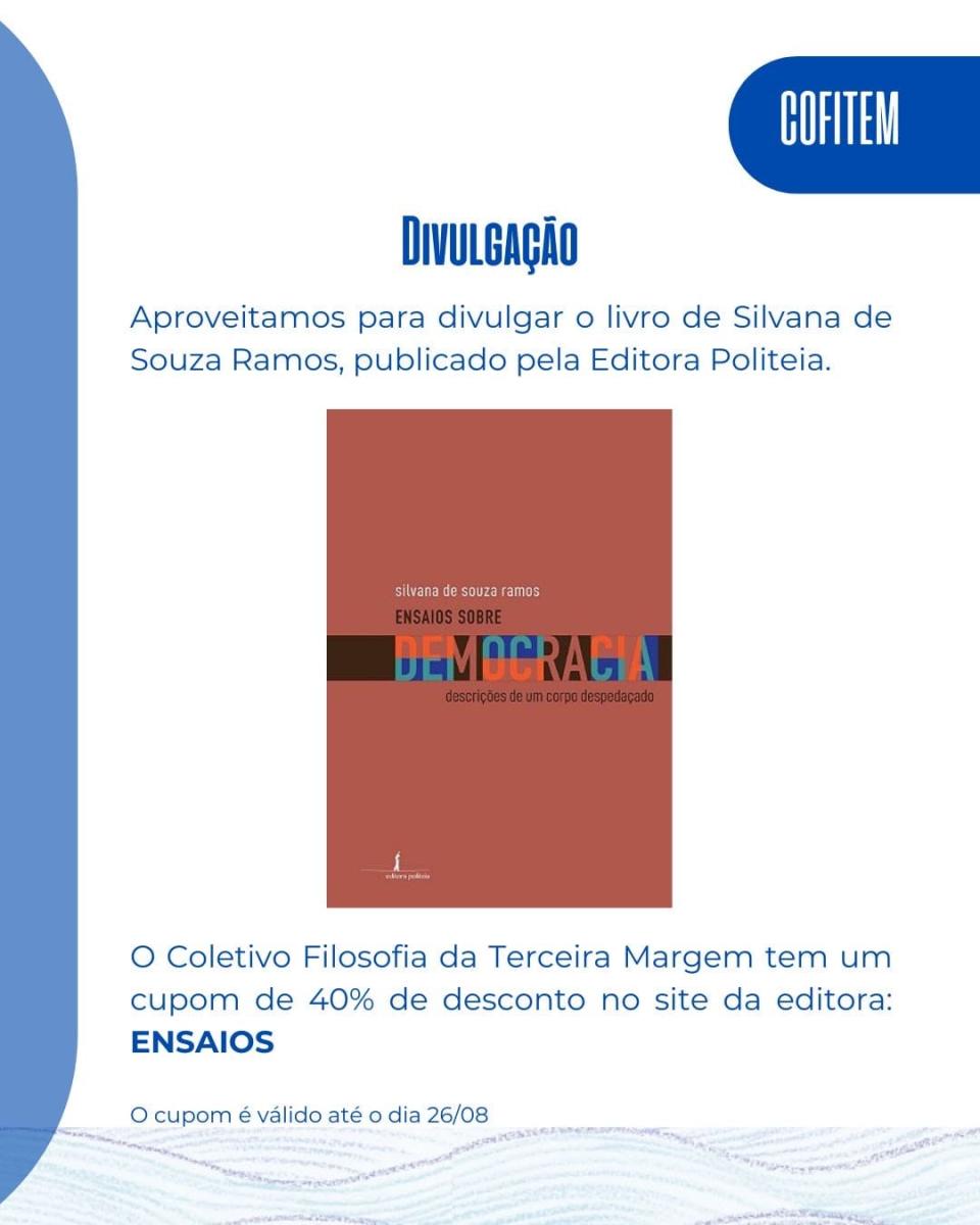 Ademais, aproveitamos para divulgar o livro da autora, "Ensaios sobre democracia: descrições de um corpo despedaçado", recém publicado pela @editorapoliteia .Até a data de nossa aula, conseguimos um cupom de 40% de desconto nas compras do livro feitas pelo site da editora.