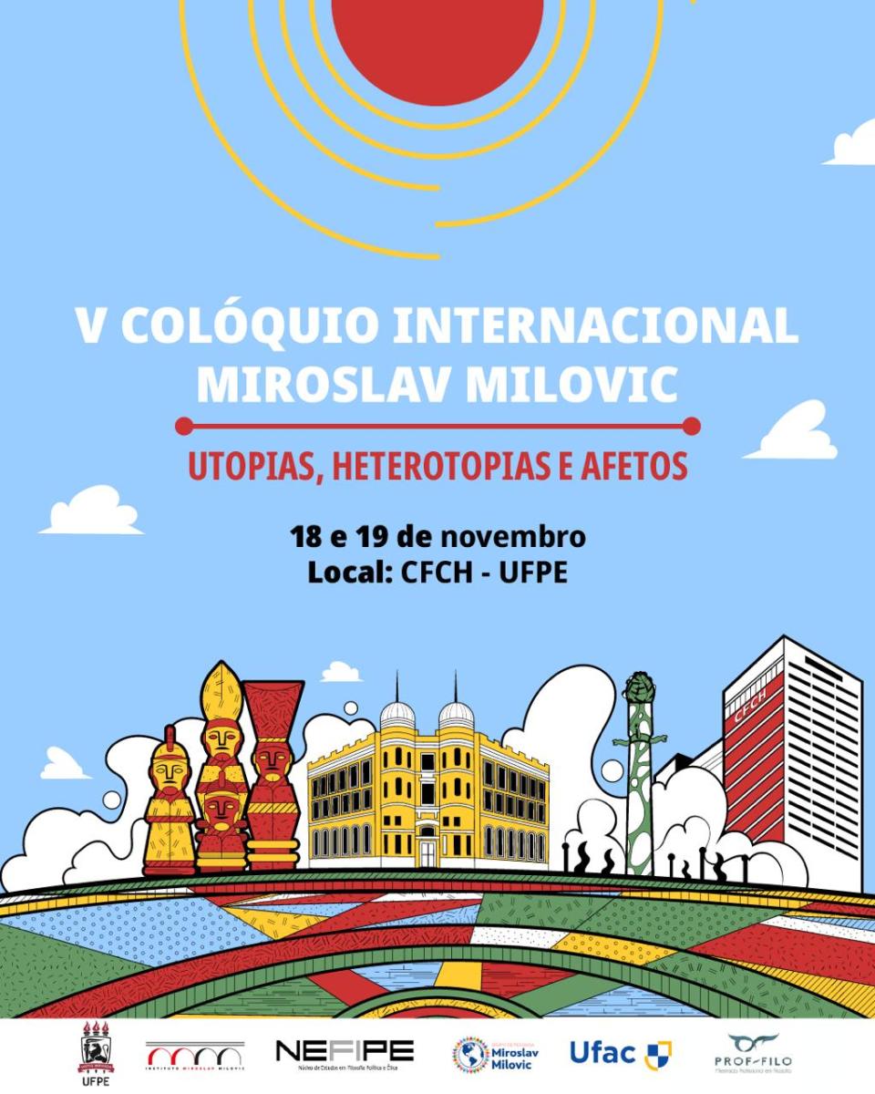 Convidamos a comunidade acadêmica para participar do V Colóquio Internacional Miroslav Milovic intitulado Utopias, Heterotopias e Afetos. O evento é aberto, gratuíto e presencial no Centro de Filosofia e Ciências Humanas (CFCH) da Universidade Federal de Pernambuco (UFPE) nos dias 18 e 19 de novembro. A Programação é bastante diversificada, com mesa em homenagem ao centenário de Deleuze, palestra dedicada ao centenário de Frantz Fanon e debates que envolvem a temática dos afetos, das artes, da democracia, da diferença e da filosofia política. Estão confirmadas participações de professores e pesquisadores da região Norte, Nordeste, Centro-Oeste e Sudeste. A Programação completa pode ser conferida no site de inscrição.