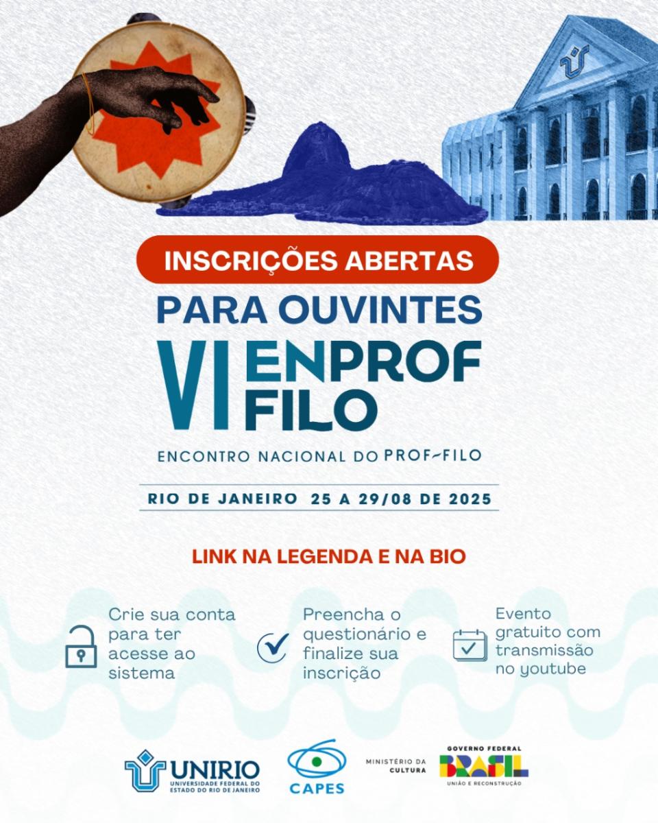O VI Encontro Nacional do PROF-FILO será realizado de 25 a 29 de agosto de 2025, na UNIRIO, no Rio de Janeiro, primeira edição do evento na Região Sudeste!