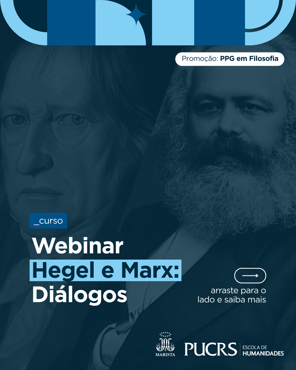No dia 7 de agosto, o PPG em Filosofia promoverá o webinar "Hegel e Marx: Diálogos". O evento será realizado no modo híbrido. Presencialmente, ocorrerá na sala 305 do prédio 8 da PUCRS, em Porto Alegre. De modo remoto, será possível acompanhar o evento pelo zoom, através do link enviado aos inscritos. O webinar contará com os seguintes palestrantes: Prof. Dr. Agemir Bavaresco (PUCRS), Profa. Dra. Polyana Tidre (UFPR), e Prof. Dr. Wécio Araújo (UFPB/Universidade de Coimbra). A atividade tem o apoio do Núcleo de Pesquisa em Filosofia Social da UFPB/CNPq, e é organizado por Marloren Lopes Miranda (PUCRS/CNpq) e Wécio Araújo (UFPB).