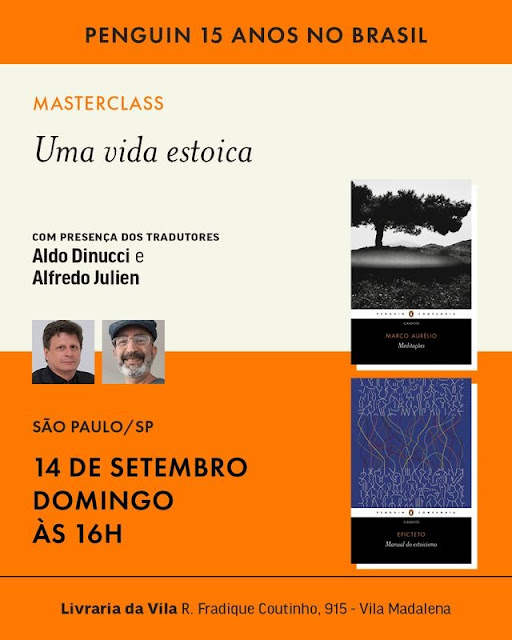 Convidamos a todos e todas para o lançamento de Epicteto, Manual de Estoicismo, que acaba de ser lançada nossa edição de Epicteto pela Companhia das Letras / Penguin. O evento acontecerá na Livraria da Vila, na rua Fradique Coutinho, 915, na Vila Madalena, São Paulo. O volume contém a tradução minha e de Alfredo Julien do Manual de Epicteto, anteriormente publicada pela Imprensa de Coimbra (2014); as quatro primeiras diatribes de Epicteto, cujo livro I publiquei também pela Imprensa de Coimbra (2019); e os fragmentos epictetianos, que eu e Julien traduzimos na primeira década deste século e que até então teve apenas uma edição universitária.